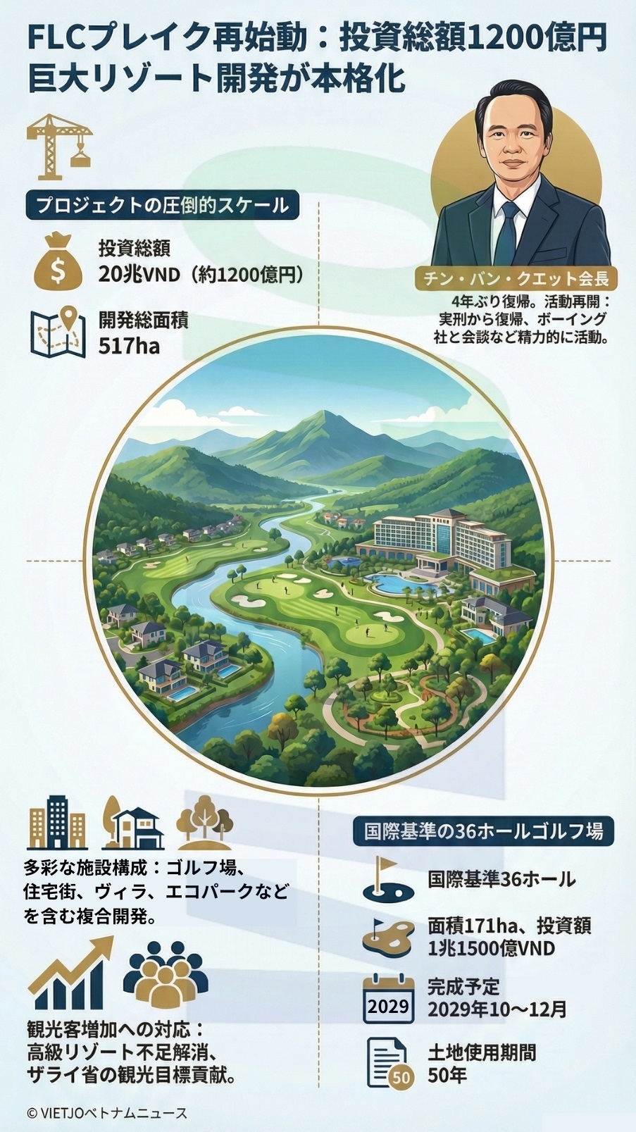 南中部地方ザライ省ダクドア村(xa Dak Doa)で4日、地場不動産デベロッパーFLCグループ[FLC](FLC Group)によるリゾート・ゴルフ場複合区「FLCプレイク(FLC Pleiku)」の起工式が開催された。同プロジェクトは長年にわたり停滞していたが、同社のチン・バン・クエット氏のトップ復帰により再始動した。