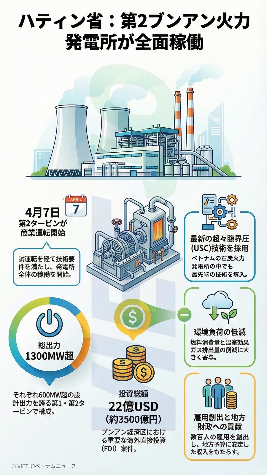 北中部地方ハティン省のブンアン経済区にある第2ブンアン火力発電所の第2タービンが7日に商業運転を開始した。事業主である第2ブンアン火力発電(VAPCO)によると、試運転を経て全ての技術的要件を満たした上での稼働となり、第1タービンと合わせて同発電所は全面稼働に入った。