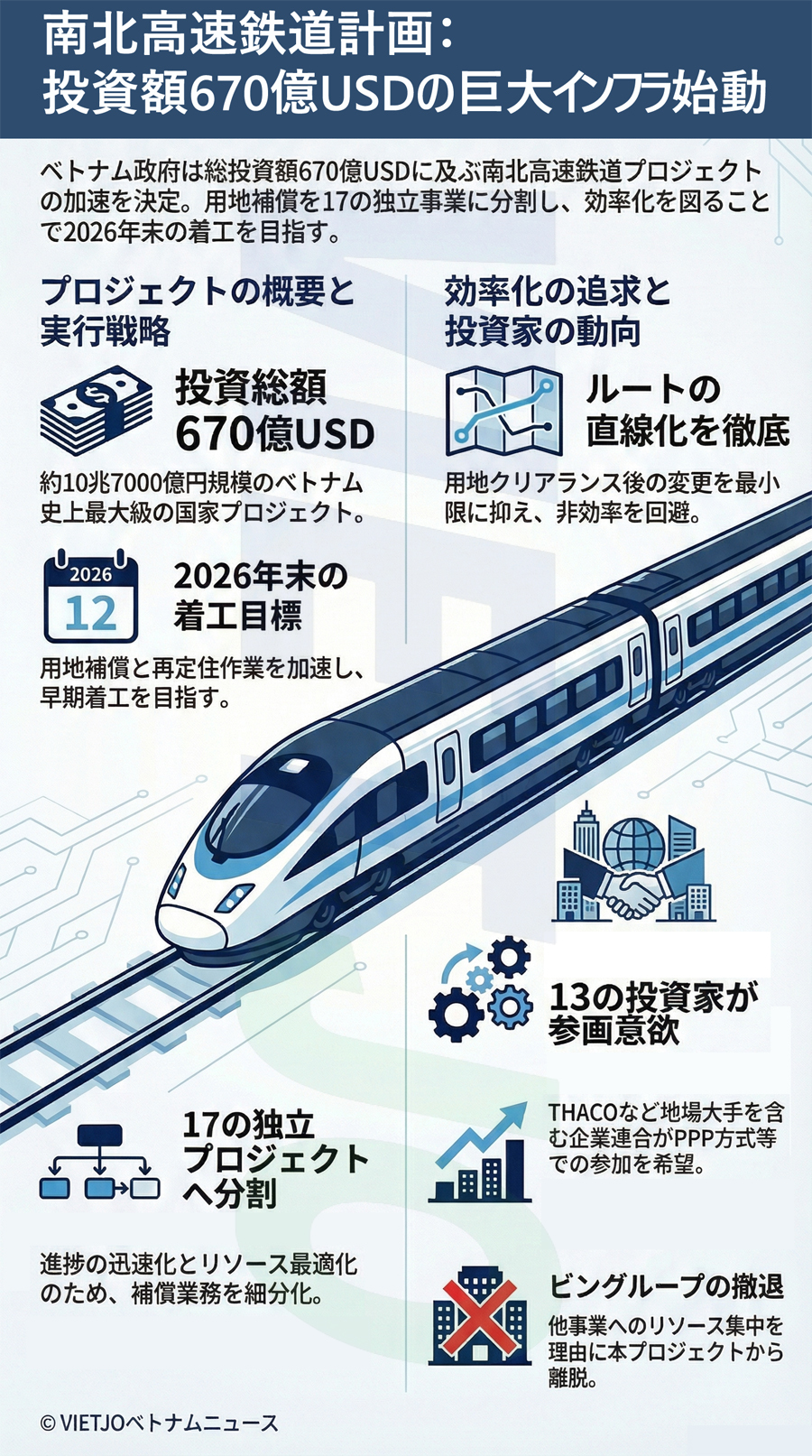 政府はこのほど、投資総額670億USD(約10兆7000億円)の南北高速鉄道プロジェクトについて、立ち退き補償・再定住に関する内容を17の独立したプロジェクトに分割することを許可する決議第98号/NQ-CPを公布した。これは進捗を加速させ、投資リソースを最適化し、2026年末の着工を目指すための措置となる。
