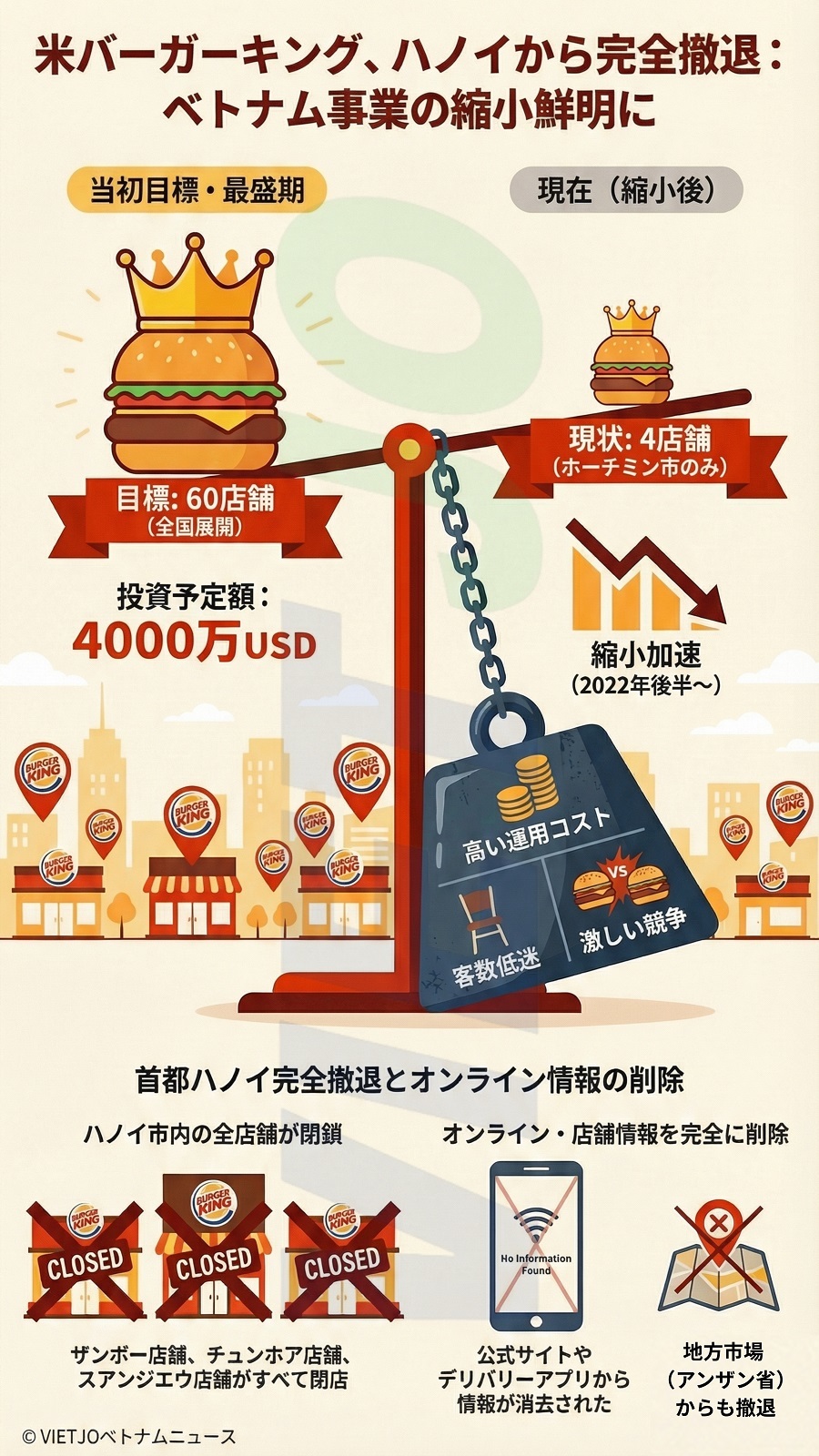米ファストフード大手のバーガーキング(Burger King)はこのほど、ハノイ市で展開していた全3店舗を閉店した。これにより、同ブランドは首都市場から完全に撤退することになった。