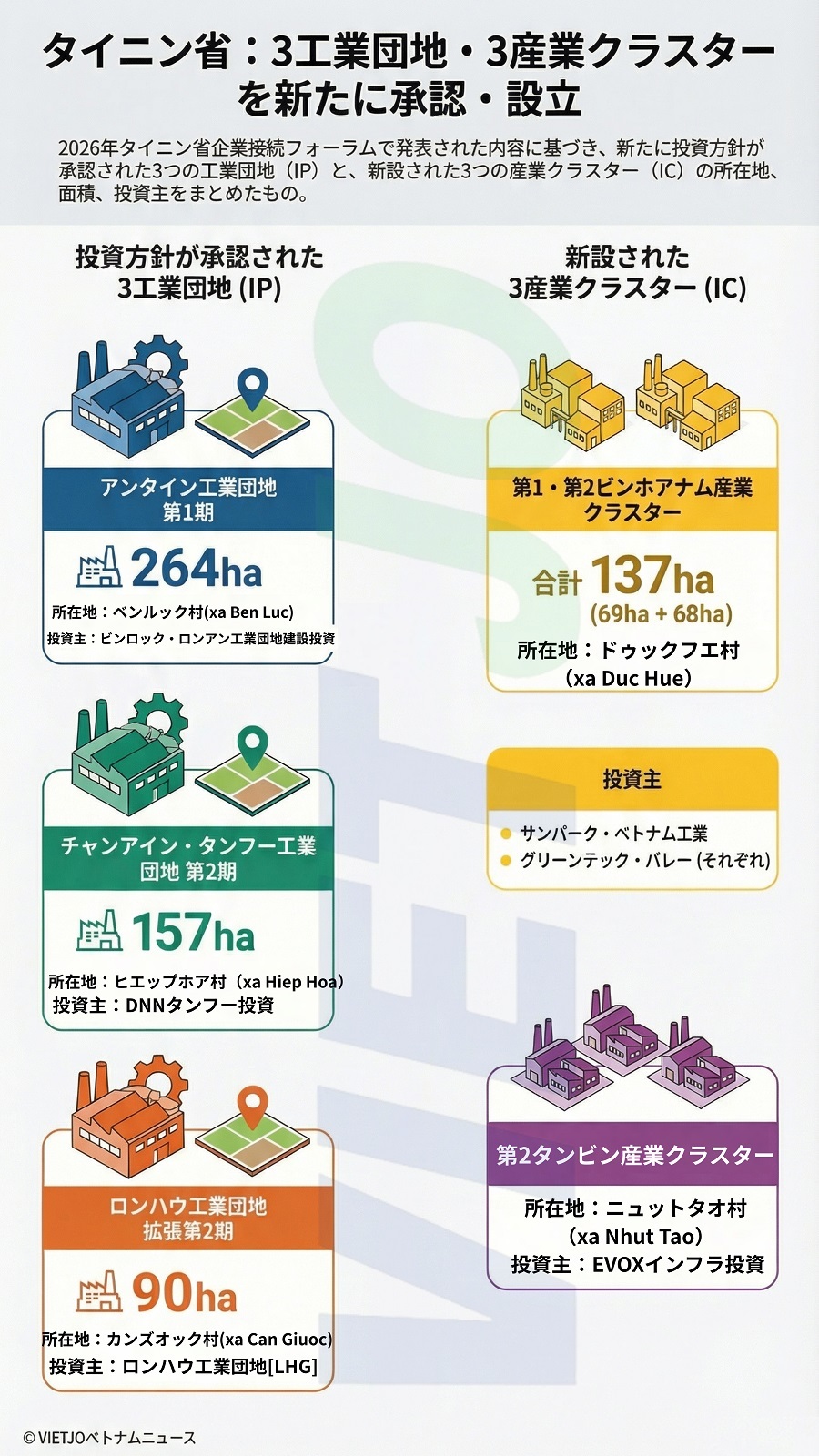 南部地方タイニン省で8日、「タイニン省ビジネスネットワークフォーラム2026」が開催され、同省人民委員会が工業団地プロジェクト3件の投資方針を承認し、新たに3か所の産業クラスターを設立する決定を発出した。