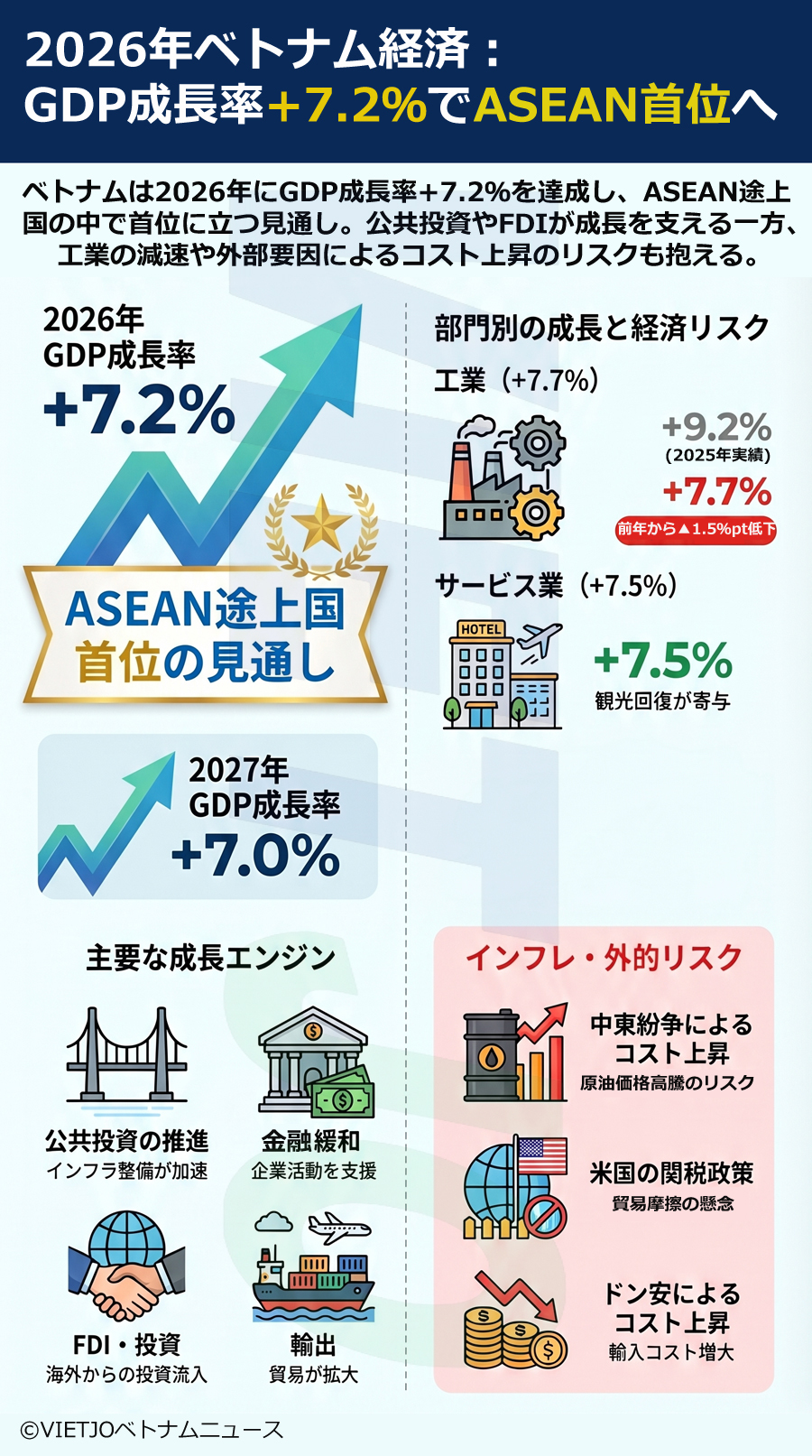 インフレ率については、2026年に+4.0%へと上昇した後、2027年には+3.8%に低下すると予測されている。長期化する中東紛争による原油価格の上昇と変動に加え、拡張的な財政政策や金融緩和策が内需を刺激し、インフレ圧力を高める要因となる。さらに、公共投資の加速や貸出活動の伸び、通貨ドン安も国内コストの上昇圧力につながる見込みだ。