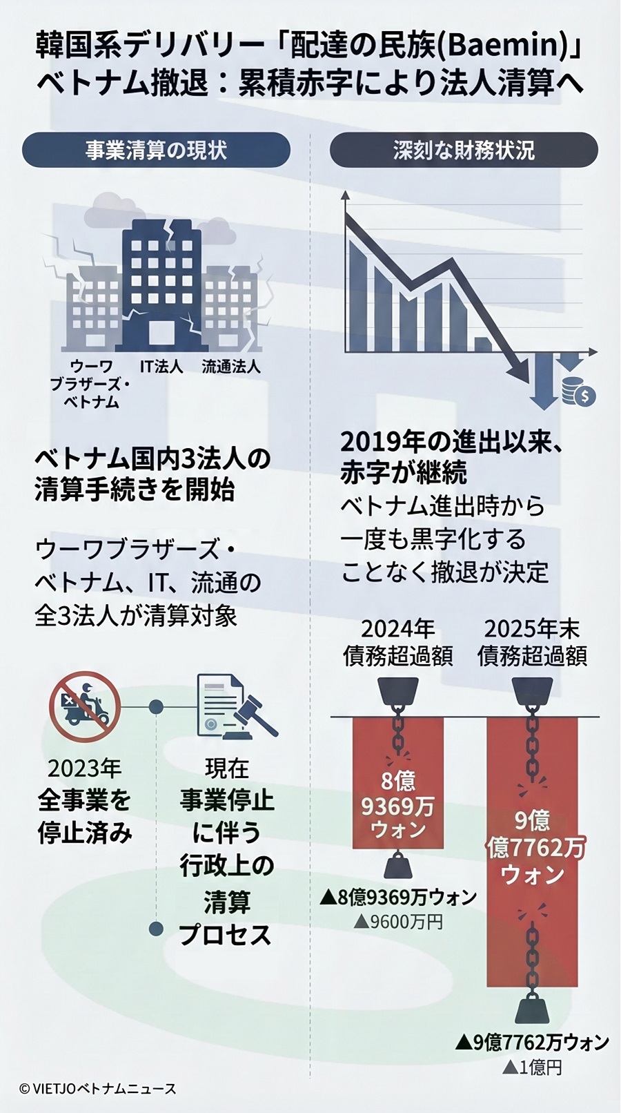 韓国最大のフードデリバリーアプリ「配達の民族(Baemin)」はこのほど、ベトナム法人のウーワブラザーズ・ベトナム(Woowa Brothers Vietnam)が清算手続き中だと発表した。