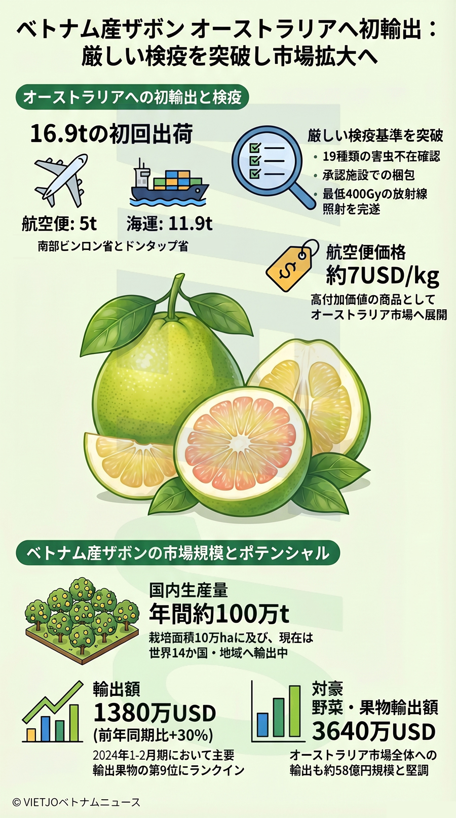 オーストラリアによるザボンの輸入許可は2025年10月に両国の農業環境省によって発表されており、同時期にオーストラリア産ブルーベリーのベトナムへの輸入も許可されていた。ベトナム農業環境省は現在、ザボンの中国市場への輸出解禁に向けた交渉も進めている。