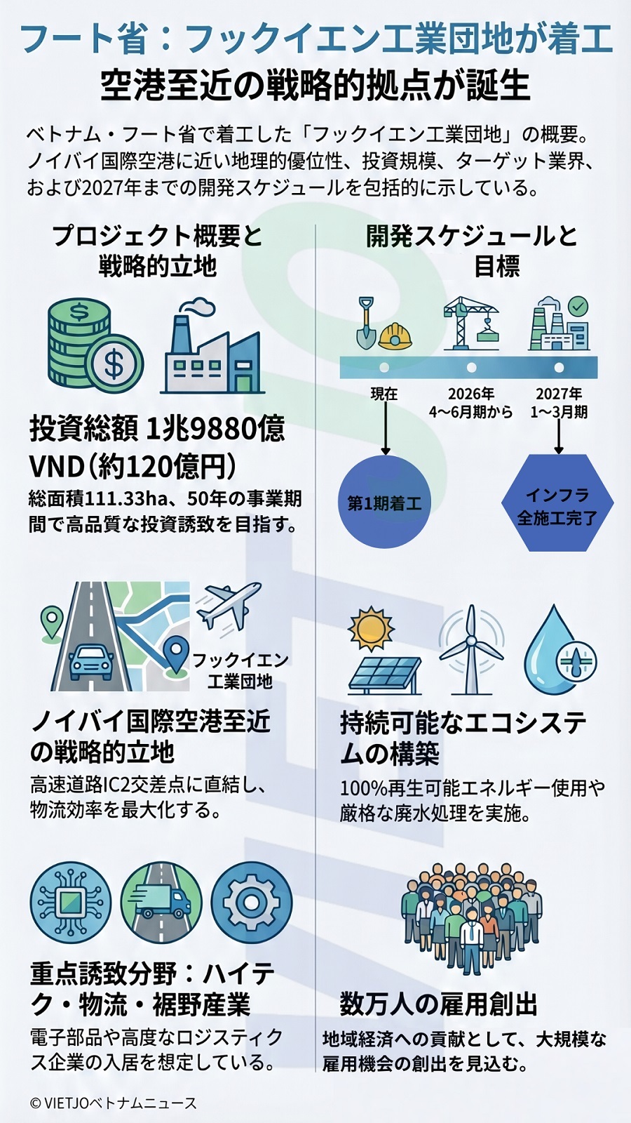 同工業団地の面積は約111.33ha、投資総額は1兆9880億VND(約120億円)で、事業期間は50年となる。ノイバイ〜ラオカイ間高速道路のIC2交差点に直結しており、ノイバイ国際空港から約10分という好立地にある。