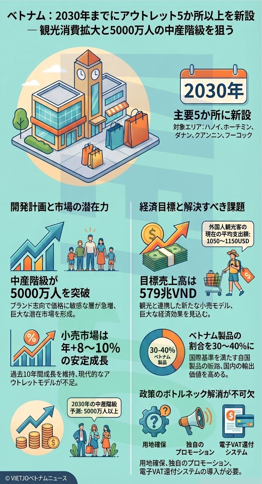 ベトナムは2030年までに、ハノイ市やホーチミン市、南中部地方ダナン市、東北部地方クアンニン省、南部メコンデルタ地方アンザン省フーコックなどの主要な地域に観光と連携したアウトレットセンターを5か所以上設立する目標を掲げている。