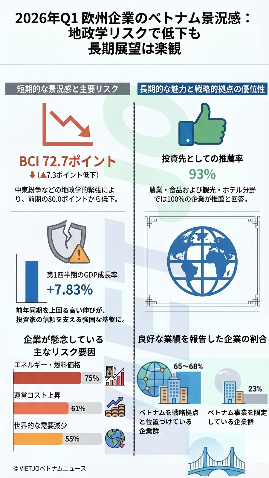 在ベトナムヨーロッパ商工会議所(ユーロチャム)がベトナムに進出している欧州企業を対象に実施した2026年第1四半期(1~3月期)業況判断指数(BCI)の調査結果によると、同期のBCIは72.7ポイントとなり、直近のピークだった前期から低下した。一方で、欧州企業のベトナムに対する長期的な投資意欲は依然として高いことが示された。