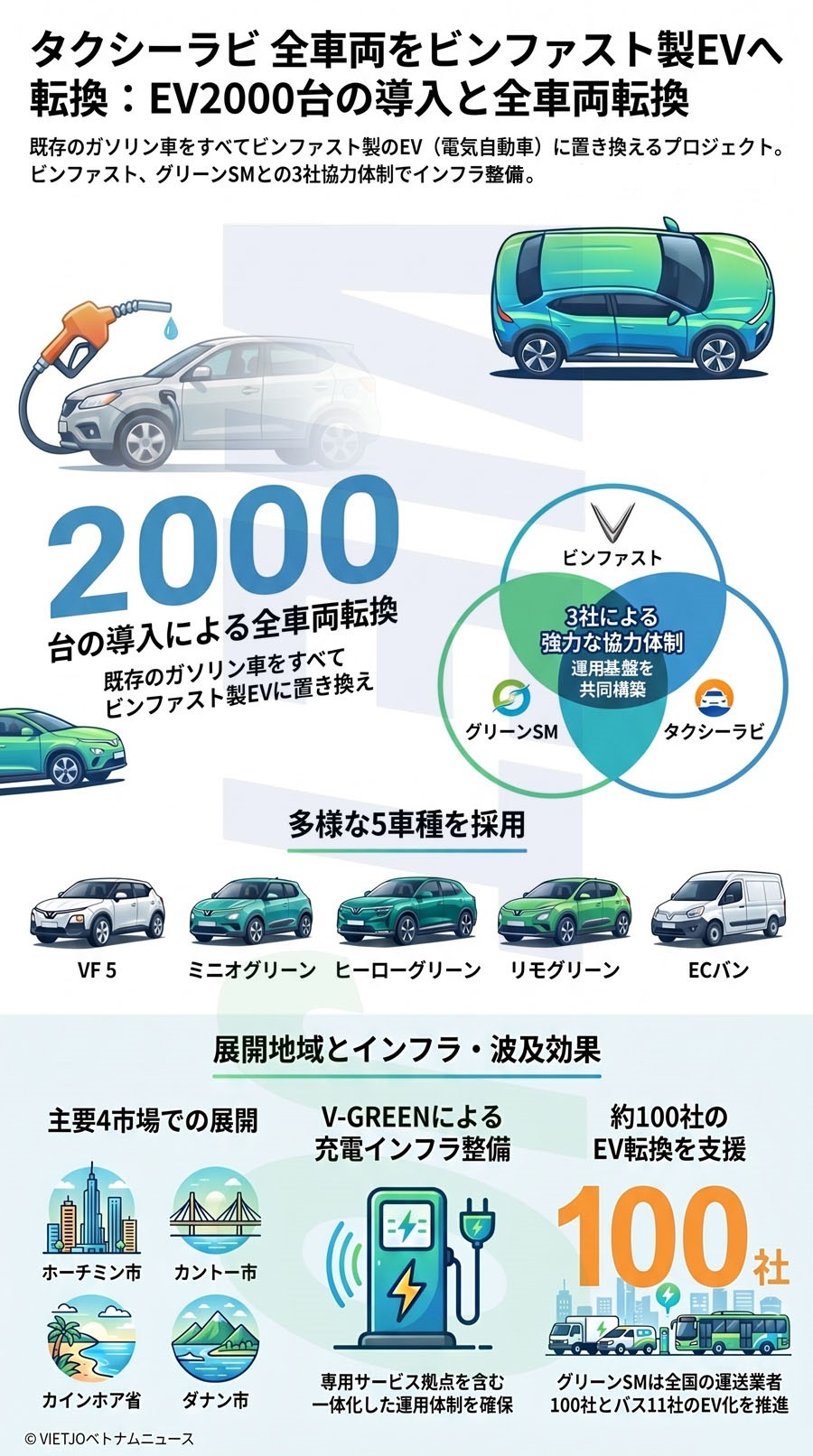 覚書によると、イーギア投資貿易は既存のタクシー全車両をビンファスト製のEV2000台に置き換える。導入する車種には、◇「ミニオグリーン(Minio Green)」、◇「ヒーローグリーン(Hero Green)」、◇「VF 5」、◇「リモグリーン(Limo Green)」、◇「ECバン(EC Van)」が含まれる。