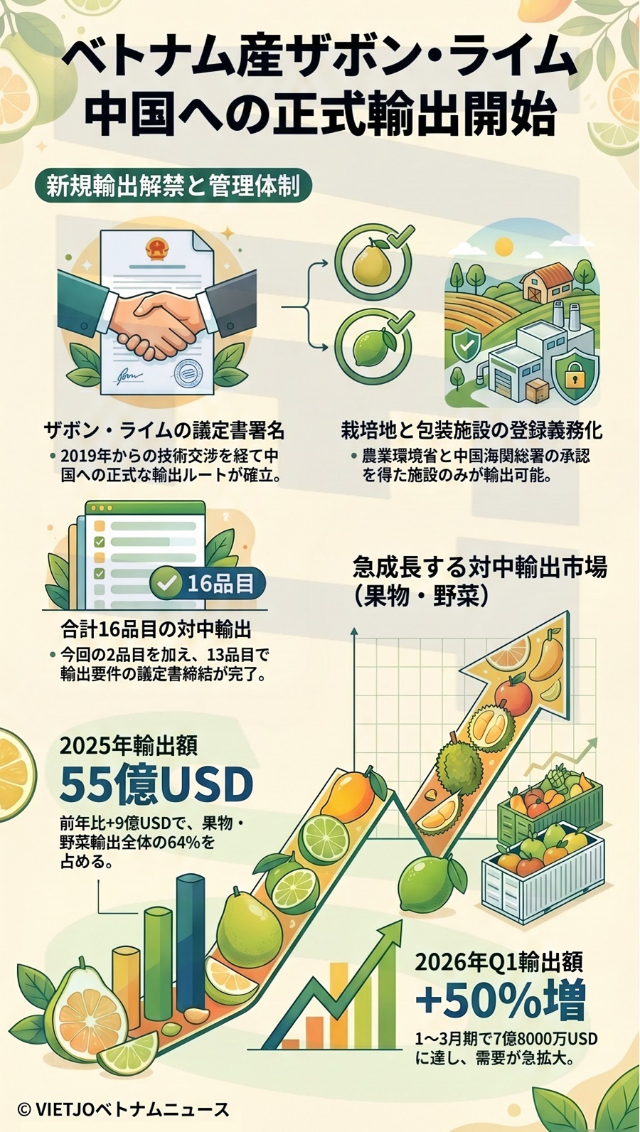 これまでに、ベトナム産の16種類の果物・野菜が中国に正式ルートで輸出されている。このうち今回のザボンとライムを含む13品目について、議定書に署名済みだ。