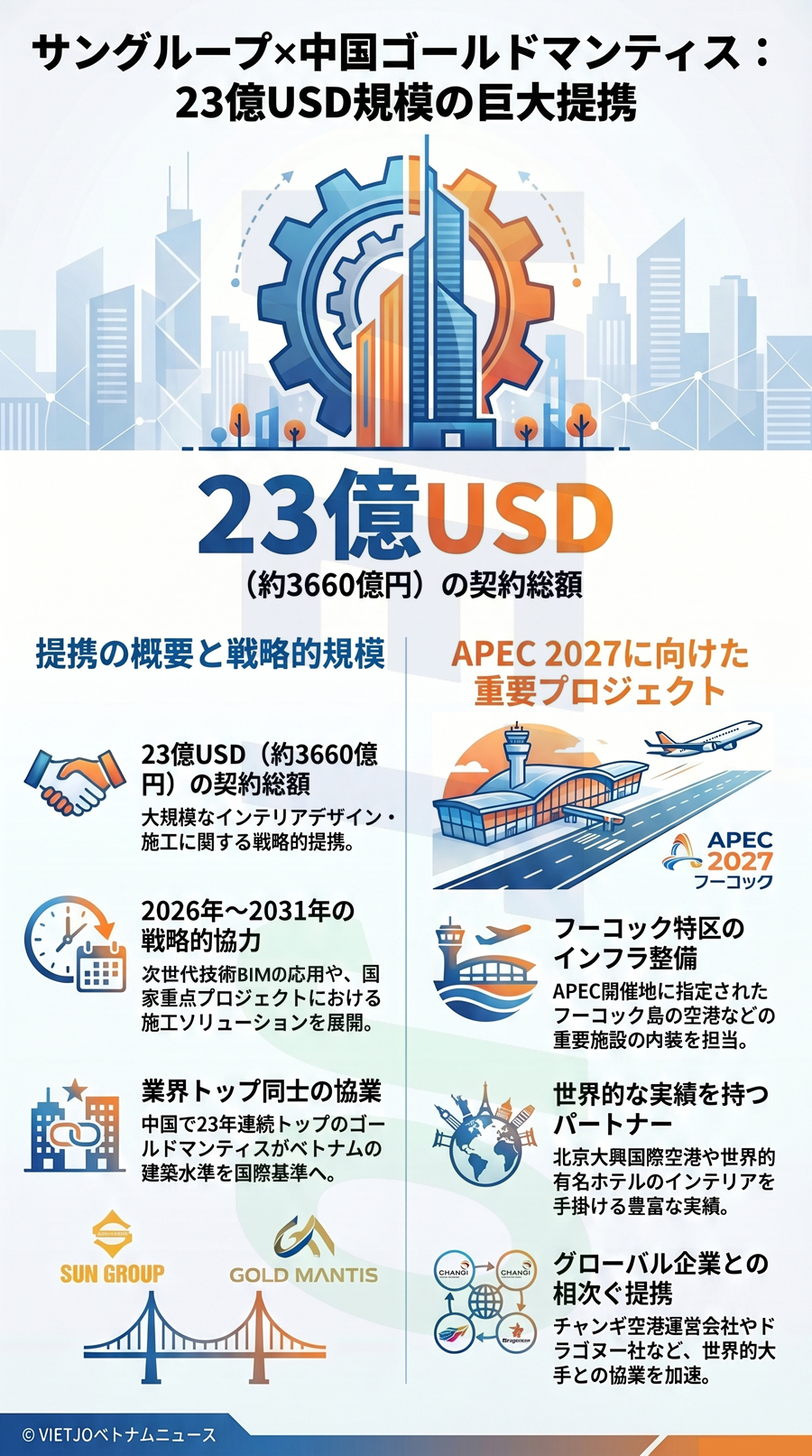 観光不動産開発を中核とする地場系コングロマリット(複合企業)サングループ(Sun Group)はこのほど、中国の内装設計・施工大手であるゴールドマンティス(Gold Mantis)との間で、インテリアデザインと施工、先進技術の応用に関する協力覚書(MOU)を締結した。契約総額は23億USD(約3660億円)に上る。