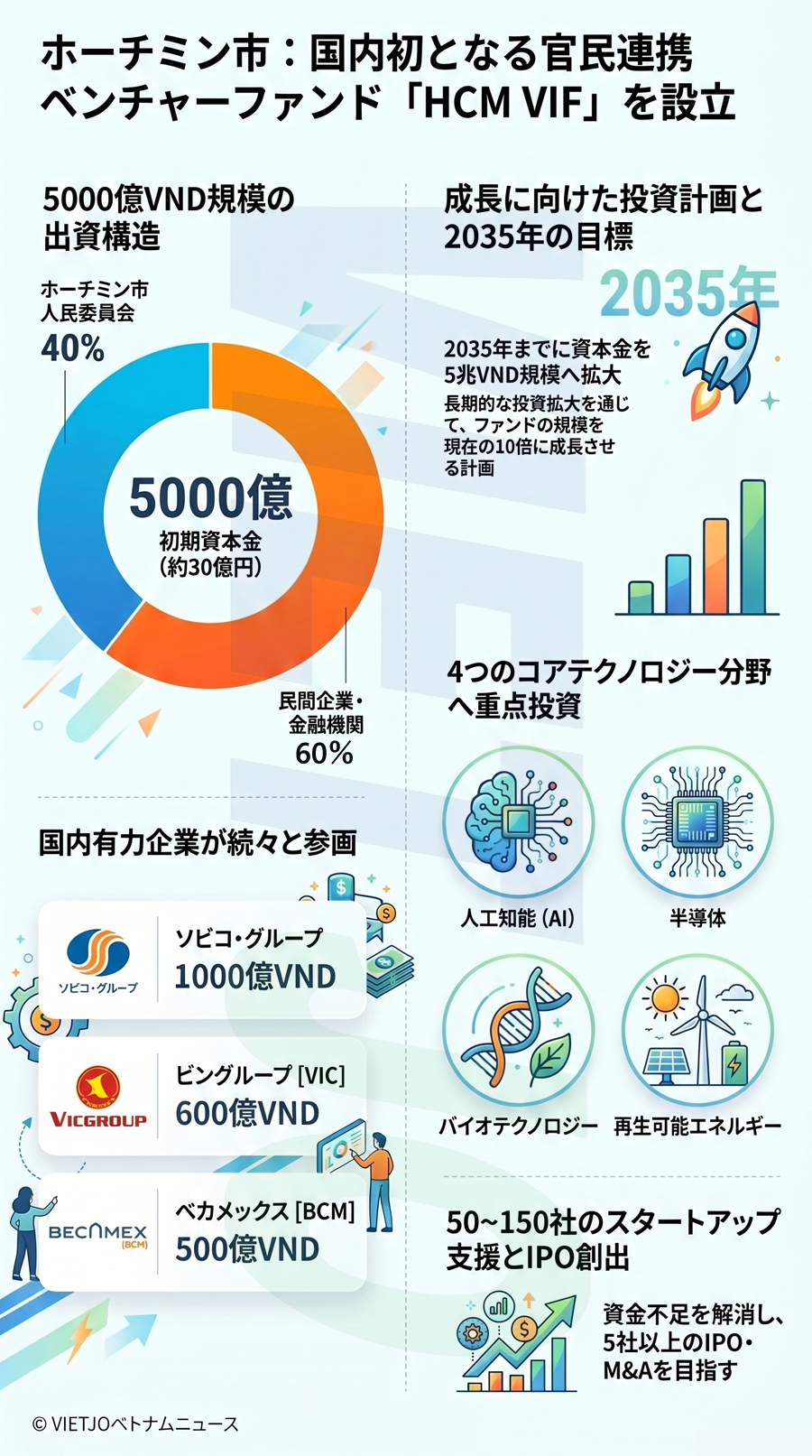 ホーチミン市は、スタートアップ企業の初期段階における資金不足という課題を解決するための呼び水として同ファンドを活用し、2035年までに資本金を5兆VND(約300億円)規模へと引き上げることを目指している。