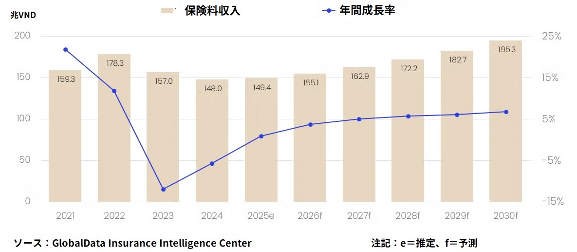 英国・ロンドンに本拠を置くデータ分析およびコンサルティング会社のグローバル・データ(GlobalData)が発表した最新のレポートによると、ベトナムの生命保険業界の保険料収入は、2026年の60億USD(約9500億円)から2030年には72億USD(約1兆1400億円)となり、年平均成長率(CAGR)+5.9%で拡大する見通しだ。