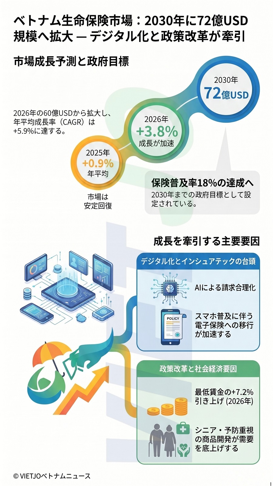 政府も、2026年1月からの地域別最低賃金の+7.2%引き上げを含む社会保険・賃金改革を進めている。こうした動きを背景に、生命保険市場は2030年までに普及率を人口の18%に引き上げるという政府目標に沿って、質の高い持続可能な成長段階に入ることが期待されている。