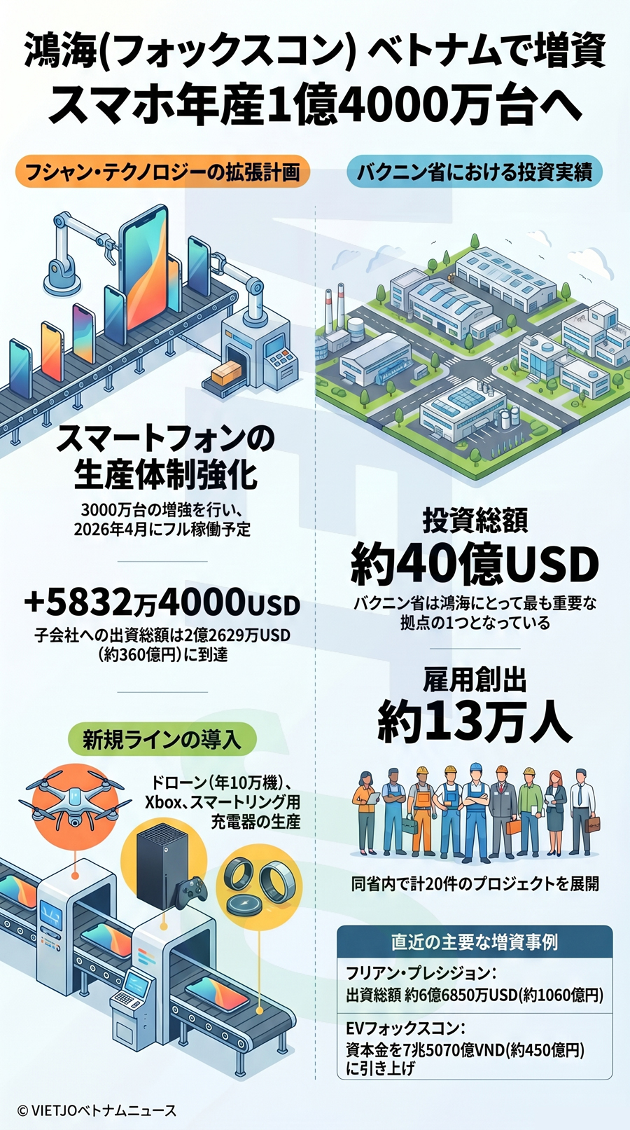 フォックスコンは2007年にベトナムへの投資を開始し、これまでにバクニン省をはじめ、ハノイ市、東北部地方クアンニン省、北中部地方ゲアン省などに進出している。中でもバクニン省は最重要拠点の1つで、同省人民委員会によると、フォックスコンは同省で20件のプロジェクトを展開し、投資総額は約40億USD(約6400億円)に上る。これにより、約13万人の雇用が創出されている。