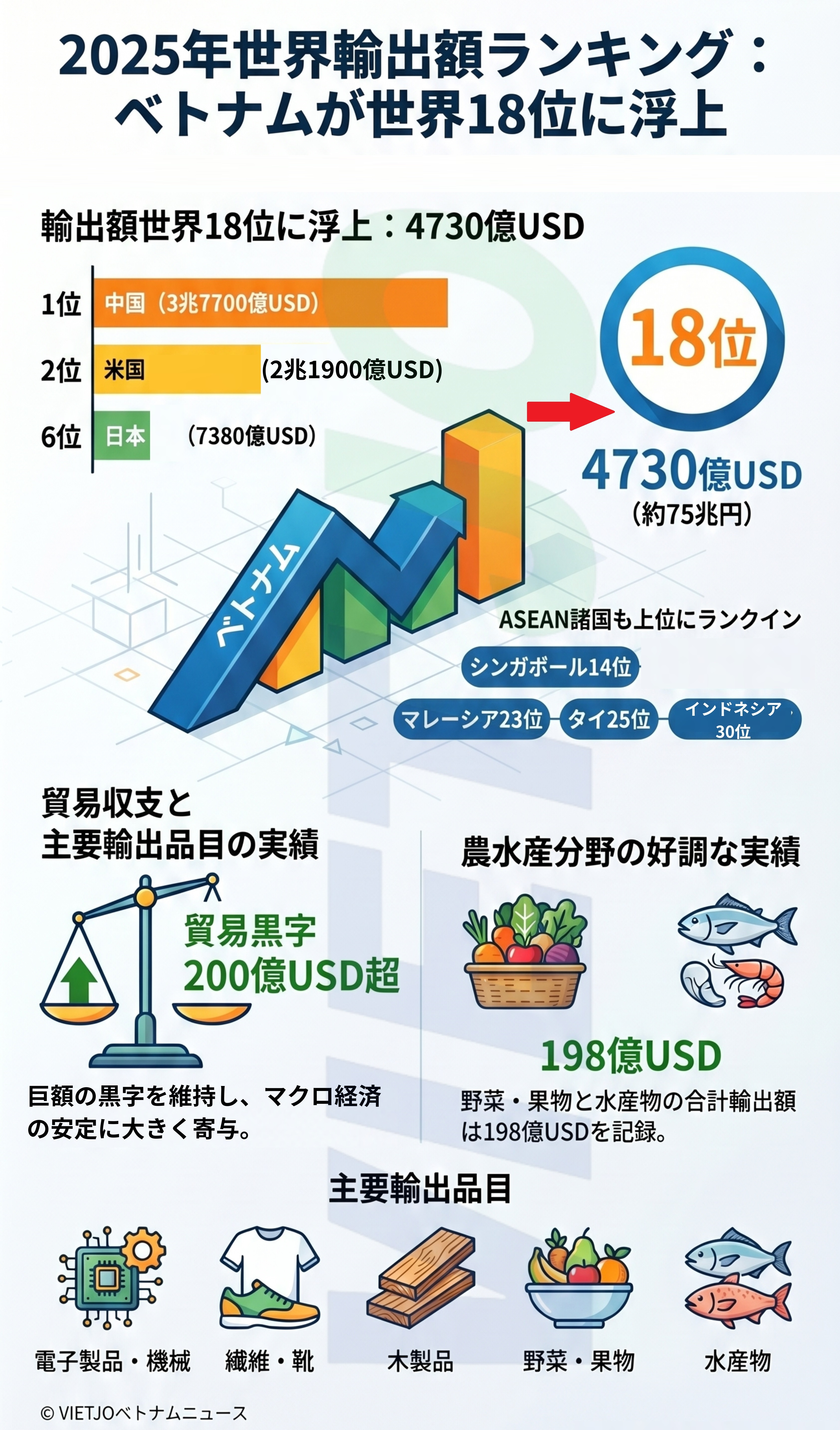 世界貿易機関(WTO)の最新データに基づく2025年における世界の輸出額上位30か国・地域のランキングで、ベトナムは輸出額4730億USD(約75兆円)となり、世界18位にランクインした。前年は世界21位だった。