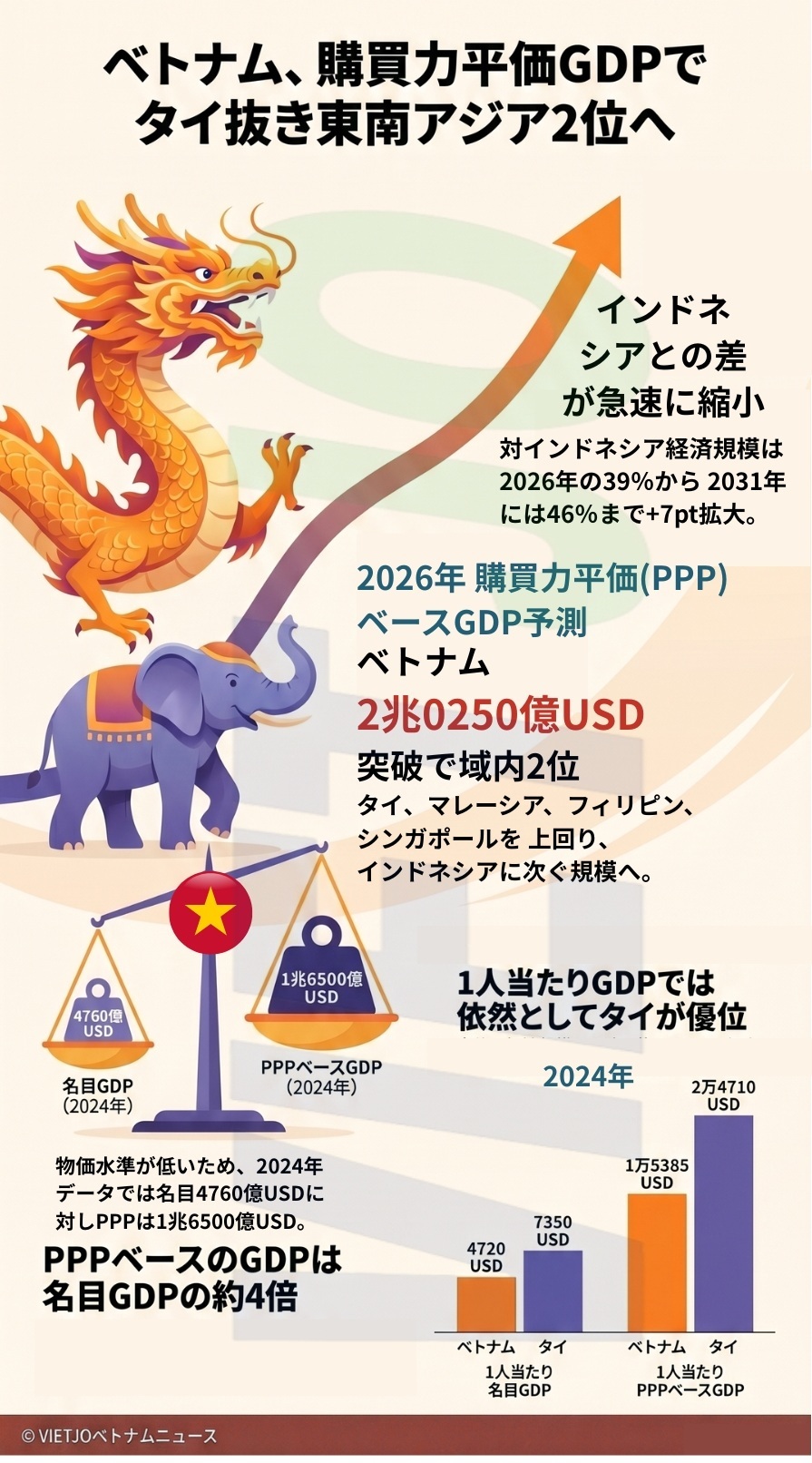 国際通貨基金(IMF)がこのほど発表した東南アジア主要6か国(ASEAN6)の経済規模に関する2026~2031年の予測によると、ベトナムは域内で最も成長が速く、購買力平価(PPP)ベースの国内総生産(GDP)でタイを抜き、東南アジア第2位の経済規模になる見通しだ。