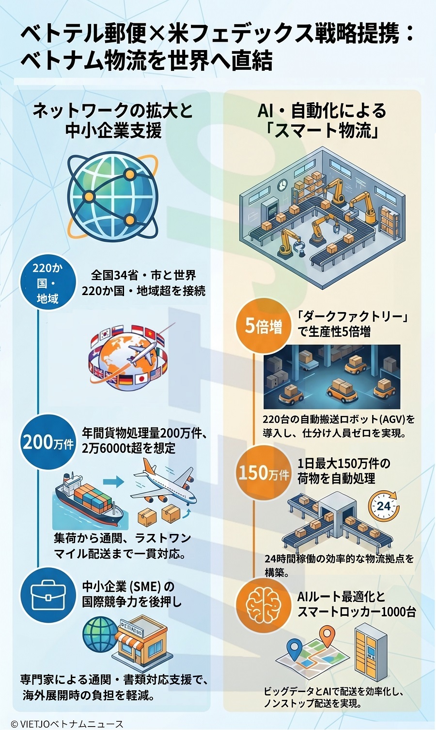 今回の提携では、人工知能(AI)と自動化技術の活用も重要な柱となる。VTPでは1日当たり最大150万件の荷物を処理しており、手作業による仕分けから全面自動化へと大きく転換している。