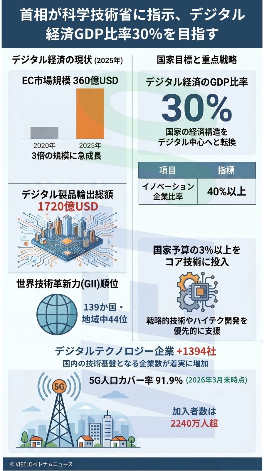 会議での報告によると、ベトナムの2025年の世界技術革新力ランキング(Global Innovation Index=GII)は139か国・地域中44位、スタートアップエコシステムは世界55位となっている。2026年3月末時点での第5世代移動通信システム(5G)の人口カバー率は91.9%に達し、加入者数は2240万人を超えた。