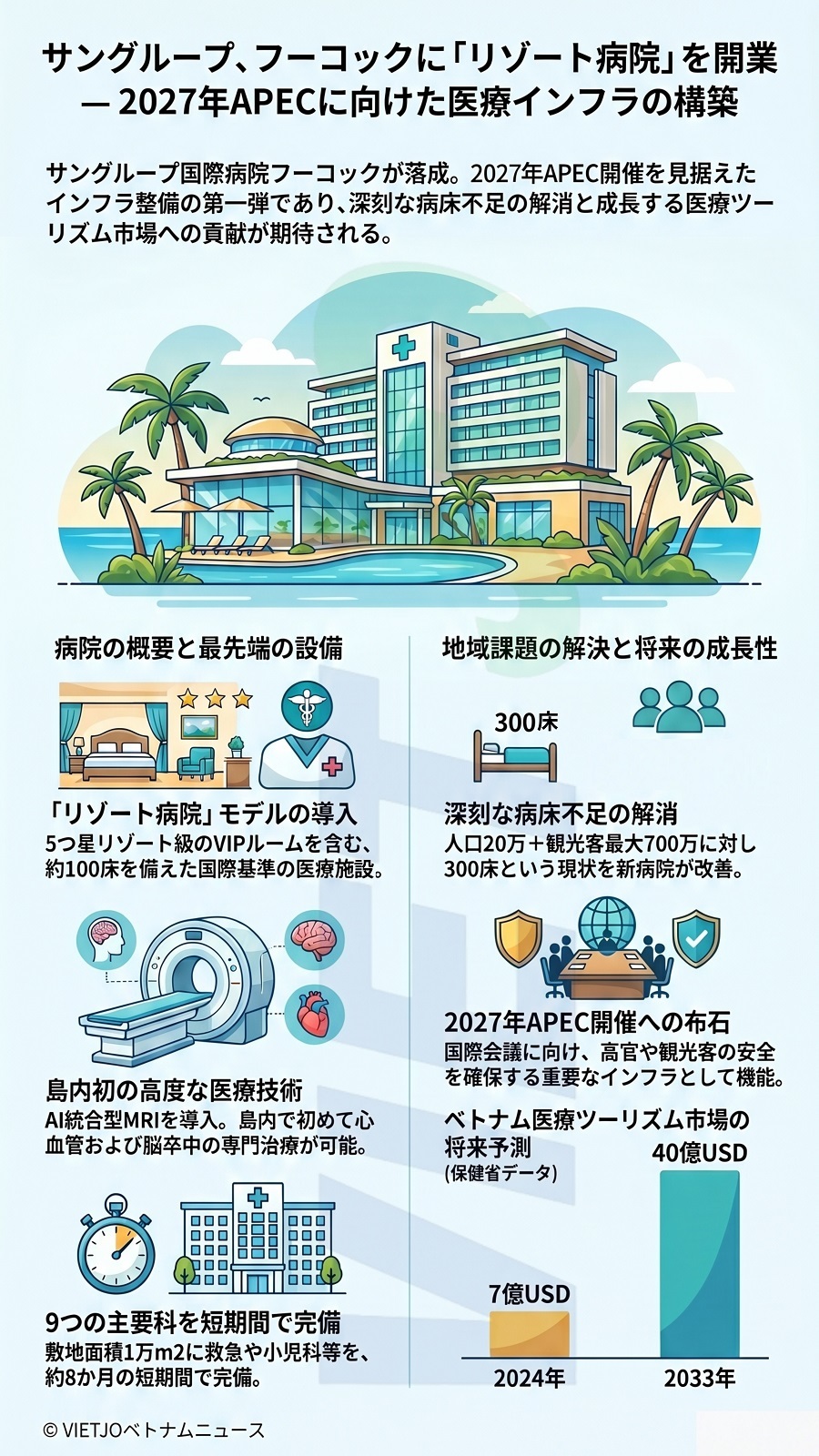 フーコック島は人口約20万人で年間600万~700万人の観光客を迎え入れるが、病床数は約300床と限られており、同病院の開業は本土への転院の負担を軽減すると期待される。