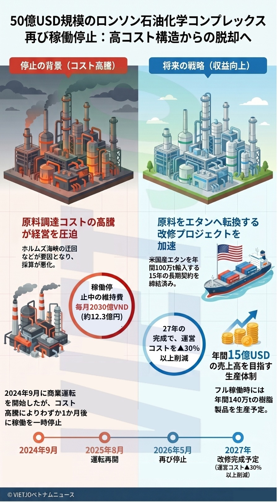 SCGによると、中東の紛争が長期化する中、ホルムズ海峡を迂回するルートで代替原料の調達を試みたが、コストが大幅に上昇し、安定的な生産活動が困難になったという。LSPの稼働停止期間中は、維持費用として毎月約2億5000万THB(約2030億VND=約12億3000万円)の追加費用が発生すると推定されている。