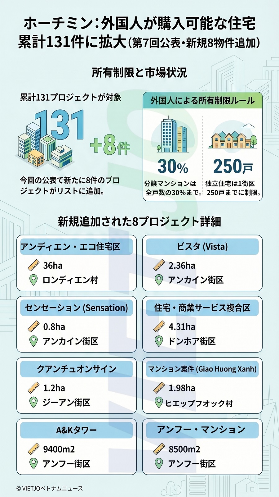 ホーチミン市はこのほど、新たに追加された外国の組織・個人による購入・所有が可能な住宅プロジェクト8件のリストを公表した。同市によるリストの公表は今回が7回目となる。今回の8件追加により、同市内で外国人が購入・所有可能な住宅プロジェクトは累計131件に拡大した。