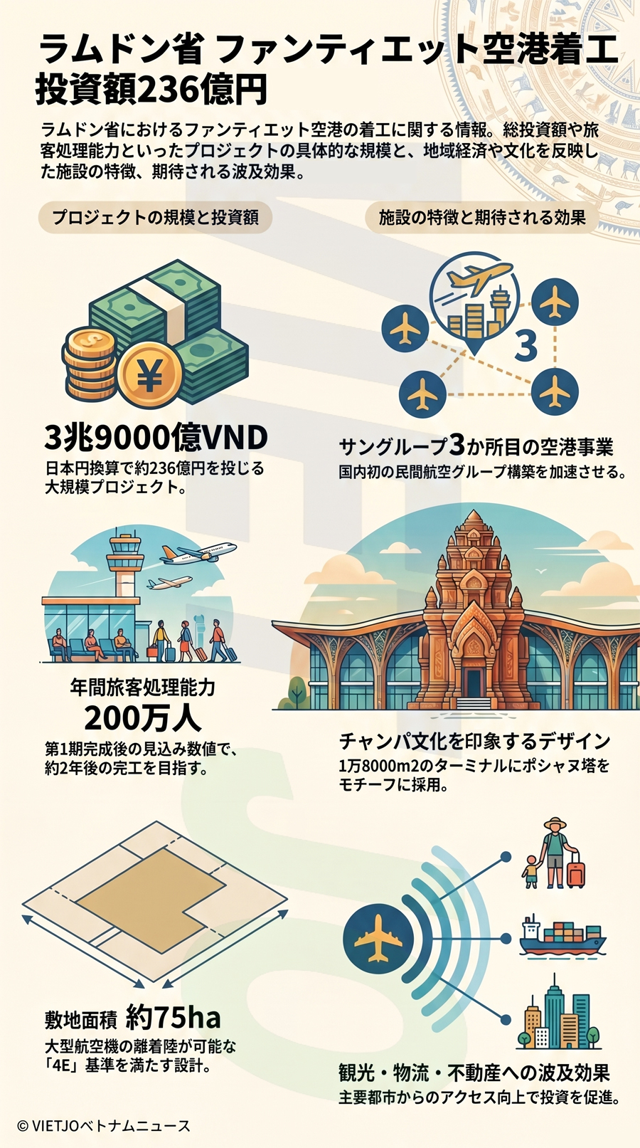 観光不動産開発を中核とする地場系コングロマリット(複合企業)サングループ(Sun Group)と南中部地方ラムドン省人民委員会はこのほど、同省(旧ビントゥアン省)のムイネー街区でファンティエット空港の民間航空施設の着工式を開催した。