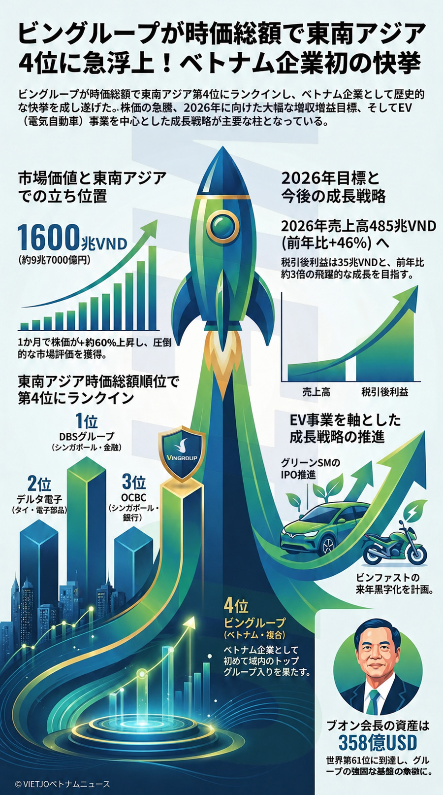 不動産開発を中核とする民間複合企業ビングループ[VIC](Vingroup)の株価が急騰し、時価総額が東南アジア第4位に浮上した。ベトナム企業が同地域のトップグループに入るのは初だ。