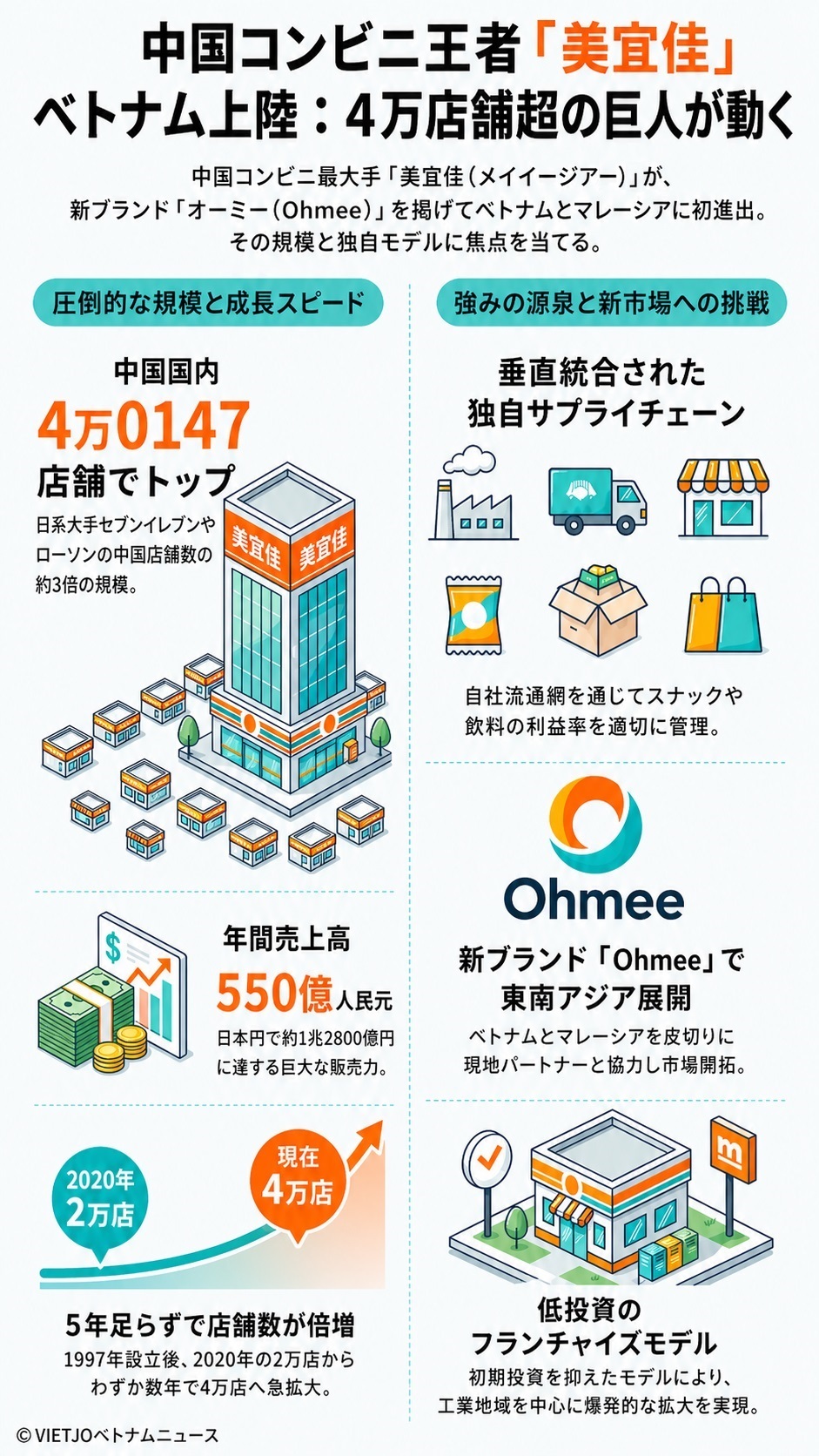 シンガポール系調査会社モメンタム・ワークス(Momentum Works)によると、中国のコンビニ最大手である美宜佳(メイイージアー=Meiyijia)が東南アジア市場に進出し、ベトナムとマレーシアに新ブランド「オーミー(Ohmee)」の初店舗をオープンした。