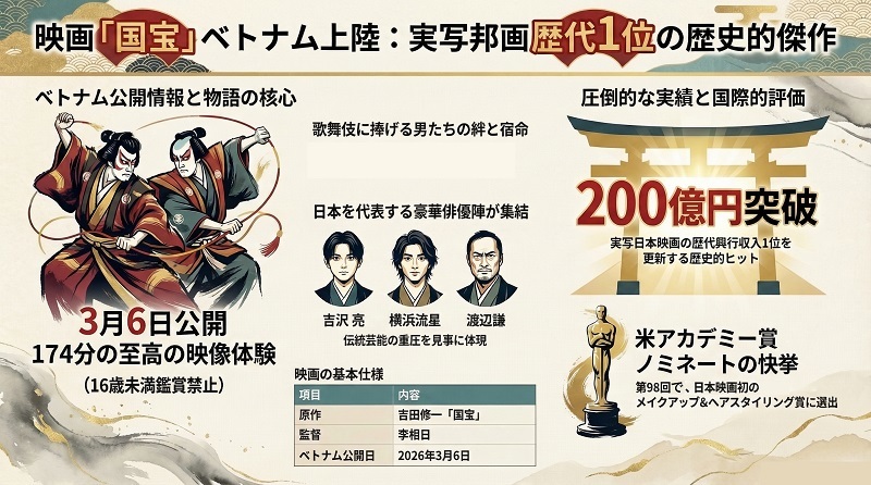 日本の伝統芸能である歌舞伎の世界を描いた映画「国宝」が、3月6日にベトナムの映画館で公開された。上映時間は174分で、ベトナムでのレイティングはT16(16歳未満鑑賞禁止)となっている。