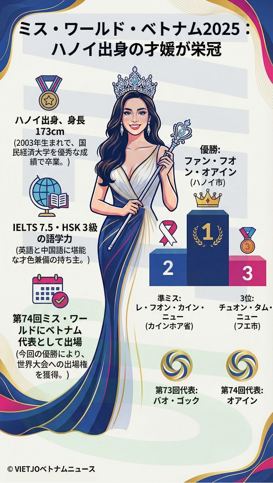 3月29日夜、「ミス・ワールド・ベトナム2025」決勝大会がホーチミン市第7軍区スタジアムで開催され、ハノイ市出身のファン・フオン・オアイン(Phan Phuong Oanh)さんが、他の46人を抑えて優勝した。