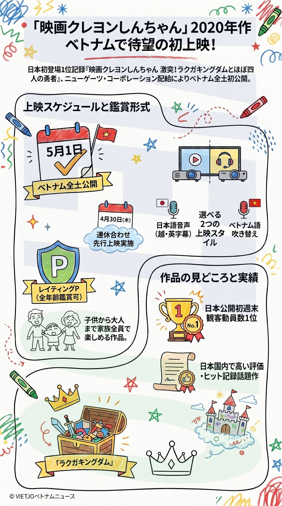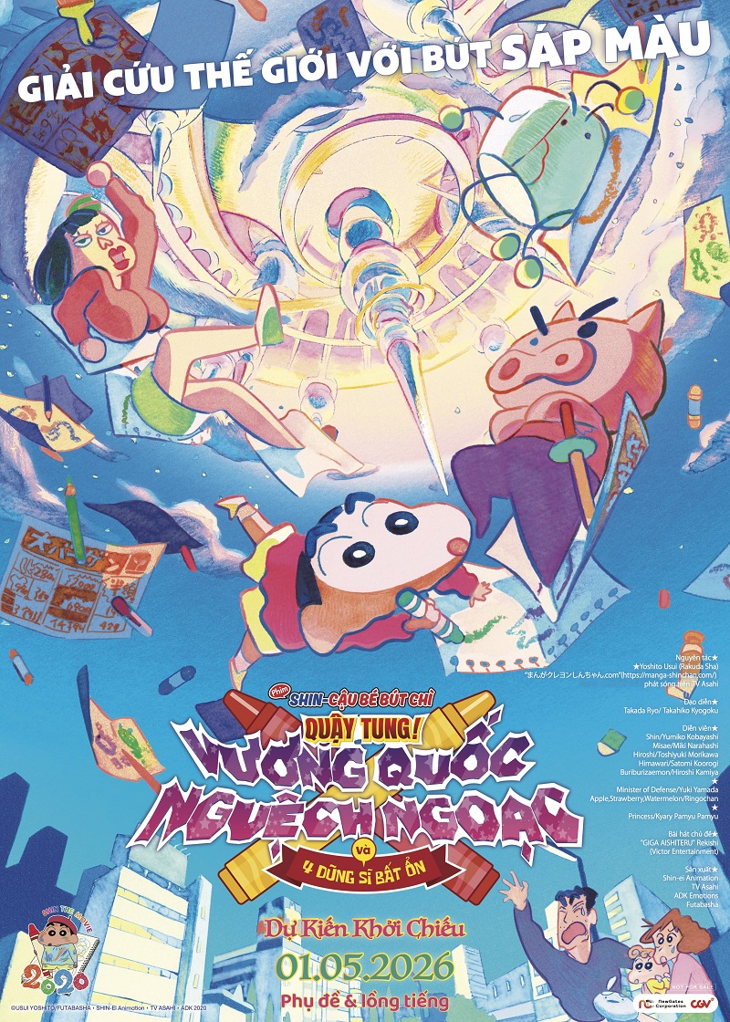 日本で2020年に公開され、大ヒットを記録した「映画クレヨンしんちゃん 激突!ラクガキングダムとほぼ四人の勇者(越題:Phim Shin - Cau Be But Chi: Quay Tung! Vuong Quoc Nguech Ngoac Va 4 Dung Si Bat On)」が、5月1日(金)にベトナム全土の映画館で公開される。また、連休初日となる4月30日(木)には、終日先行上映が行われる。