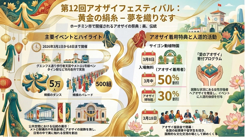 ホーチミン市で3月1日(日)から8日(日)まで、「第12回アオザイフェスティバル」が開催されている。今年のイベントは「黄金の絹糸-夢を織りなす」をテーマに行われている。