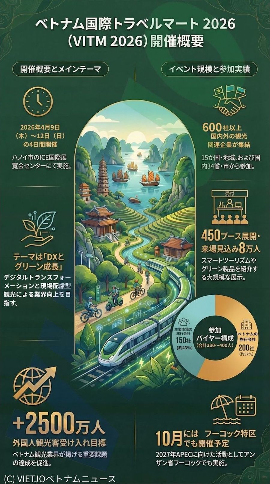 なお、今年10月7日(水)から9日(金)までは、南部メコンデルタ地方アンザン省のフーコック特区(島)で「ベトナム国際トラベルマート・フーコック2026(VITM Phu Quoc 2026)」が開催される予定だ。これは2027年にベトナムで開催されるアジア太平洋経済協力会議(APEC)首脳会議に向けた活動の一環となる。