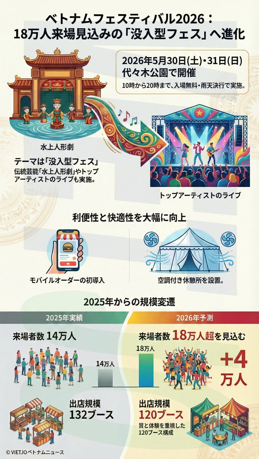 また、大人気の伝統芸能である水上人形劇が今年も会場に登場するほか、ベトナムのトップアーティストの出演も予定されている。ベトナムらしい装飾によるフォトスポットや、多彩なベトナムフード・文化ブースも展開され、日本とベトナムの人々が出会い、文化やビジネスを通じて交流を深める場となる。