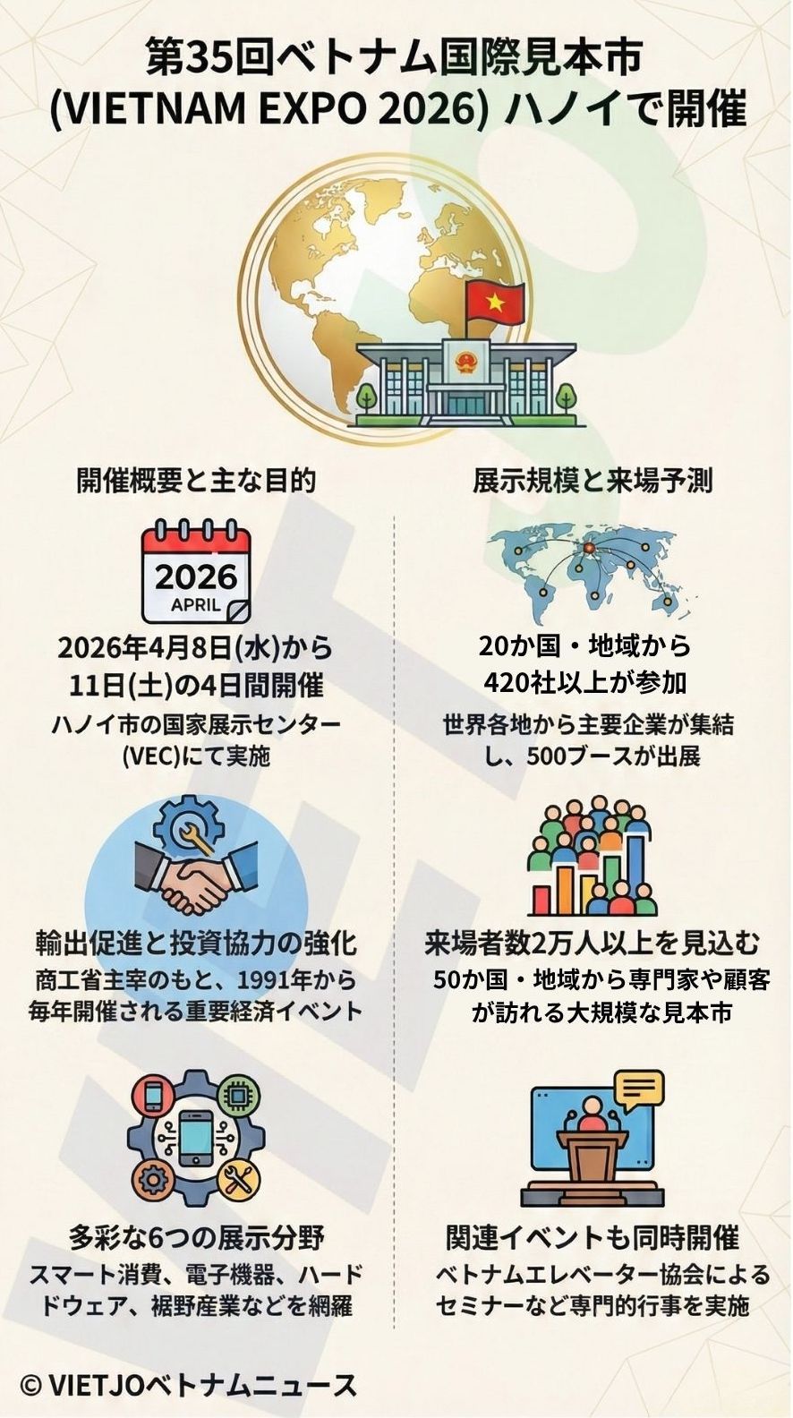 ハノイ市ドンアイン村の国家展示センター(VEC)で、4月8日(水)から11日(土)まで、「第35回ベトナム国際見本市(Vietnam Expo 2026)」が開催される。