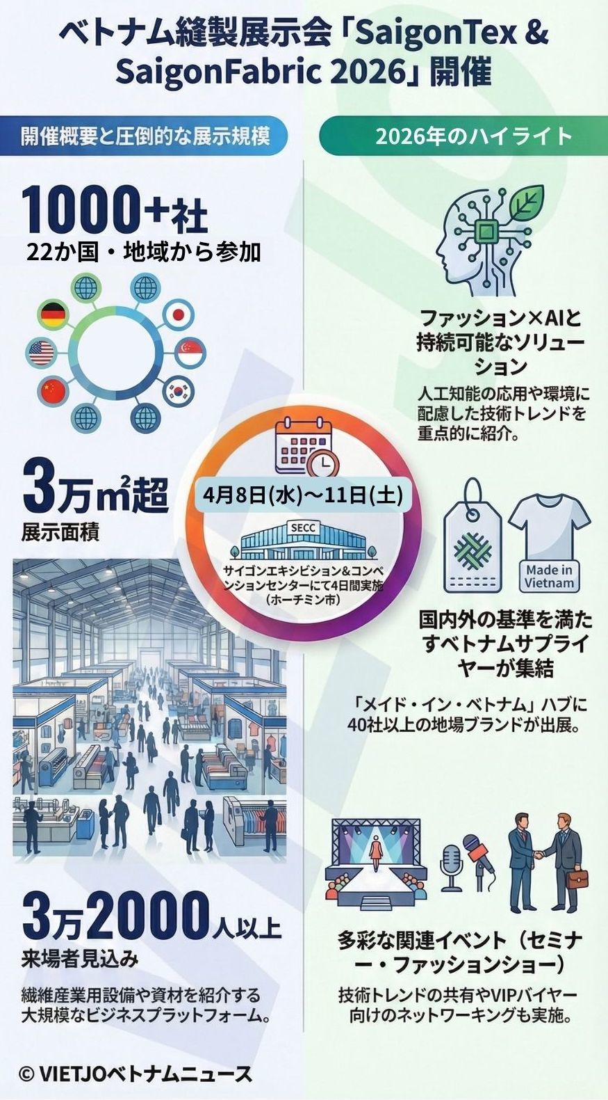 ホーチミン市タンミー街区(旧7区)のサイゴンエキシビション&コンベンションセンター(SECC:799 Nguyen Van Linh, phuong Tan My, TP. Ho Chi Minh)で、4月8日(水)から11日(土)まで、縫製展示会「SaigonTex & SaigonFabric 2026」が開催される。