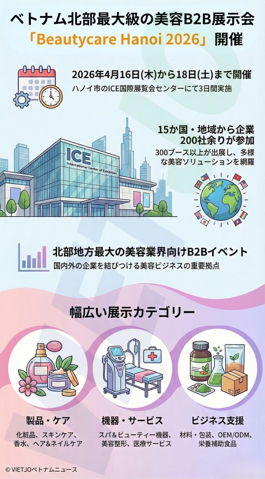 ハノイ市のICE国際展覧会センター(91 Tran Hung Dao, phuong Cua Nam, TP. Ha Noi)で、4月16日(木)から18日(土)まで、美容業界の国際展示会「ベトナム・ビューティーケア・エキスポ2026(Vietnam Beautycare Expo - Beautycare Hanoi 2026)」が開催される。