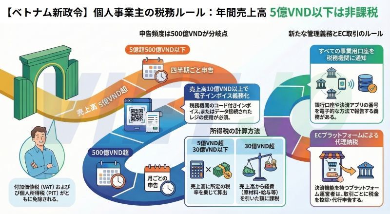 政府は5日、個人事業主に対する税制および税務管理について規定した政令第68号/2026/ND-CPを公布した。即日施行された同政令では、年間売上高5億VND(約300万円)を基準に課税対象を分けるとともに、電子商取引(eコマース=EC)プラットフォームでの納税ルールや電子インボイスの導入義務などを規定している。