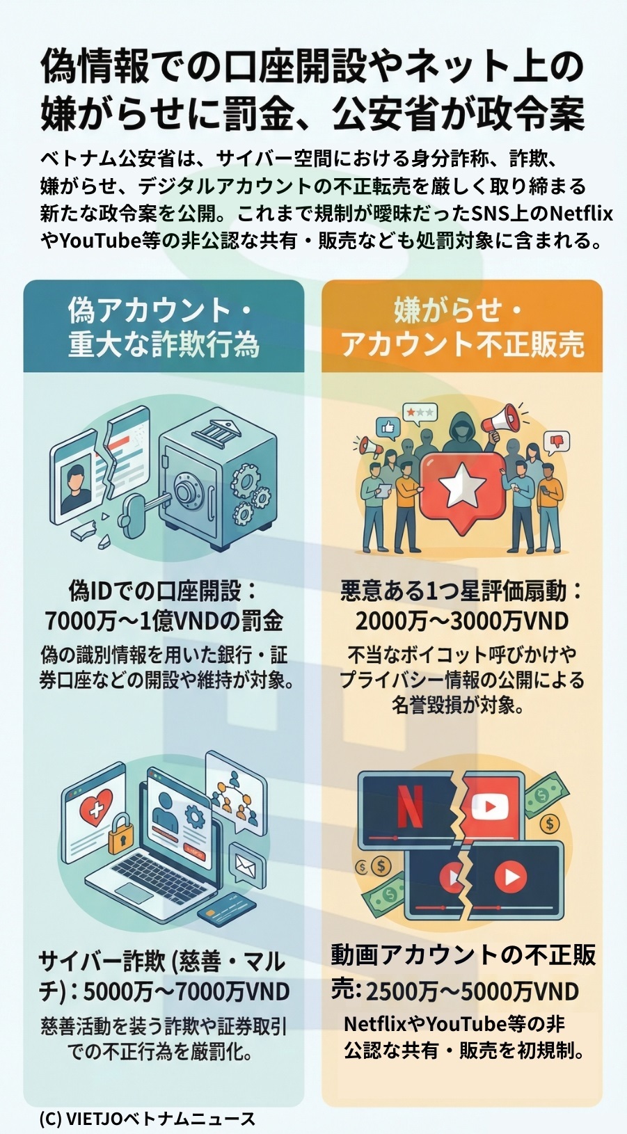 また、サイバー空間を利用して慈善活動を装う詐欺や、マルチ商法による詐欺、証券取引での詐欺行為には、5000万~7000万VND(約30万~42万円)の罰金が提案されている。