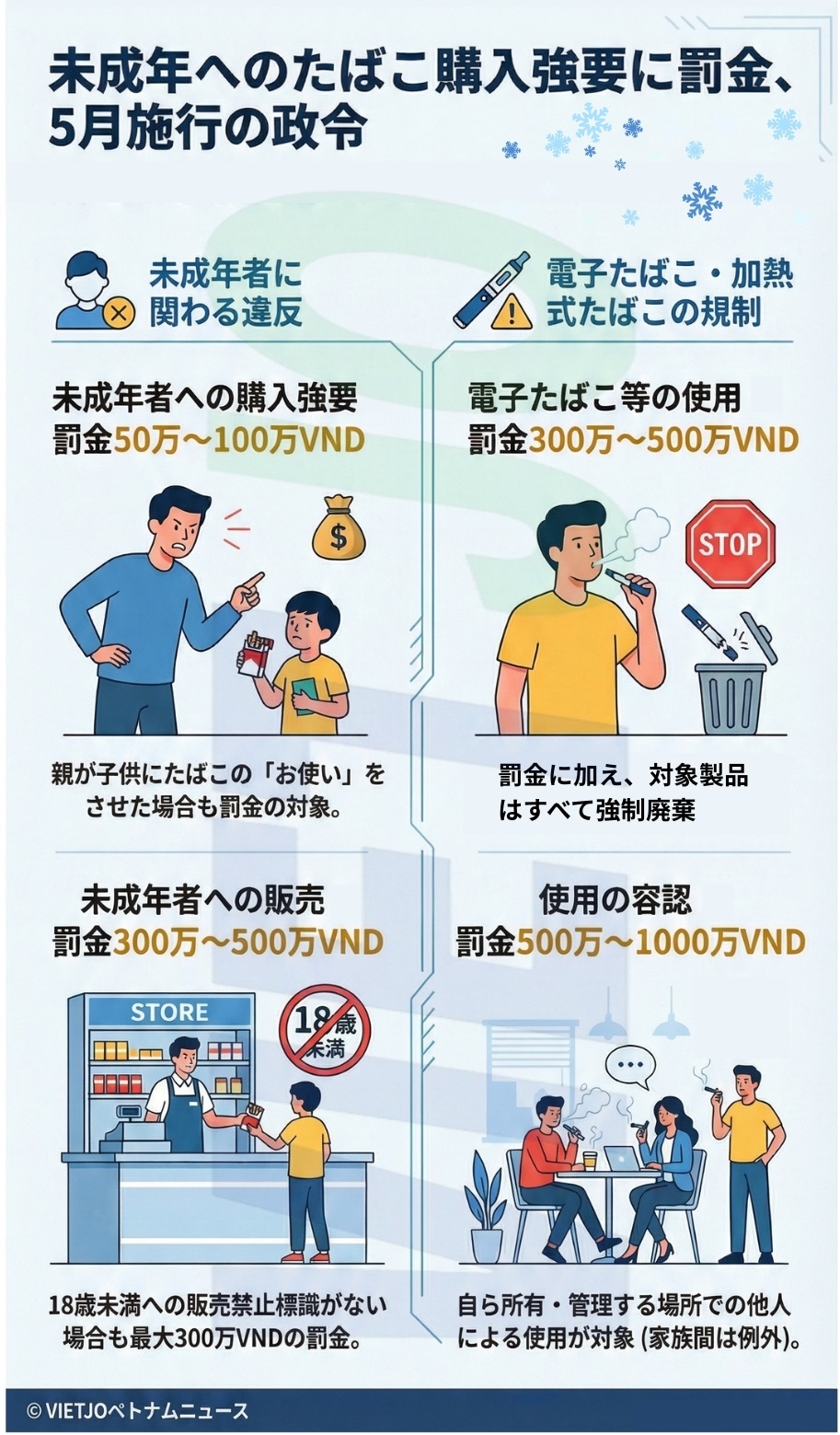 政令第90号/2026/ND-CPの第29条2項によれば、18歳未満の者にたばこを購入させる行為、または他人にたばこの使用を奨励・強制する行為に対して、50万~100万VND(約3000~6000円)の罰金が科される。親や保護者が18歳未満の子どもに、お使いでたばこを買いに行かせた場合も罰金の対象となる。