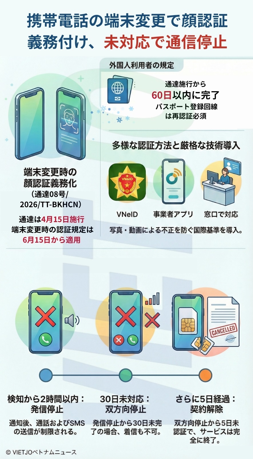 科学技術省は3月31日、地上モバイル通信サービスの加入者情報の認証に関する通達第8号/2026/TT-BKHCNを発出した。