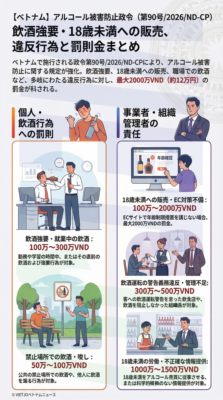 また、勤務・学習直前、勤務・学習時間中または休憩時間中に飲酒する行為、他人に飲酒を強要する行為に100万~300万VND(約6000~1万8000円)の罰金を定めている。