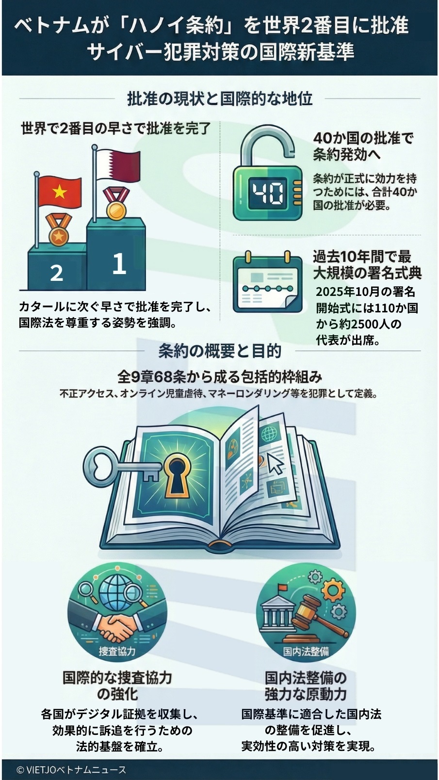 ハノイ条約は、デジタルトランスフォーメーションと広範な国際統合が進む中、サイバー犯罪の予防や発見、捜査、処分の実効性を高めるための重要な国際的法的基盤となる。また、国際基準に適合した国内法体系の整備を促進する重要な原動力にもなる。