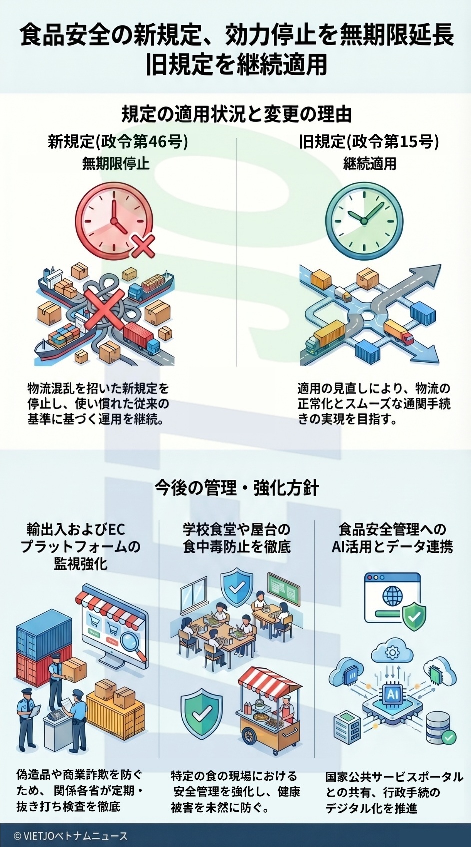 これを受け、政府は2月に決議第9号/2026/NQ-CPを公布して4月15日まで両文書の効力を一時停止していた。今回公布された決議第15号により、決議第9号は置き換えられ、効力停止の期間が改正食品安全法およびそれをガイダンスする政令の施行まで実質的に無期限延長された形となる。