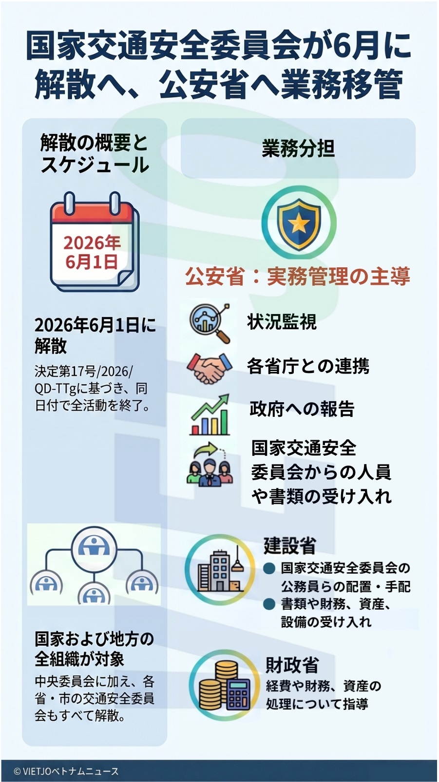同決定が発効する2026年6月1日をもって、国家交通安全委員会および省・市の交通安全委員会の組織と活動に関する2017年6月22日付けの決定第22号/2017/QD-TTgは失効する。