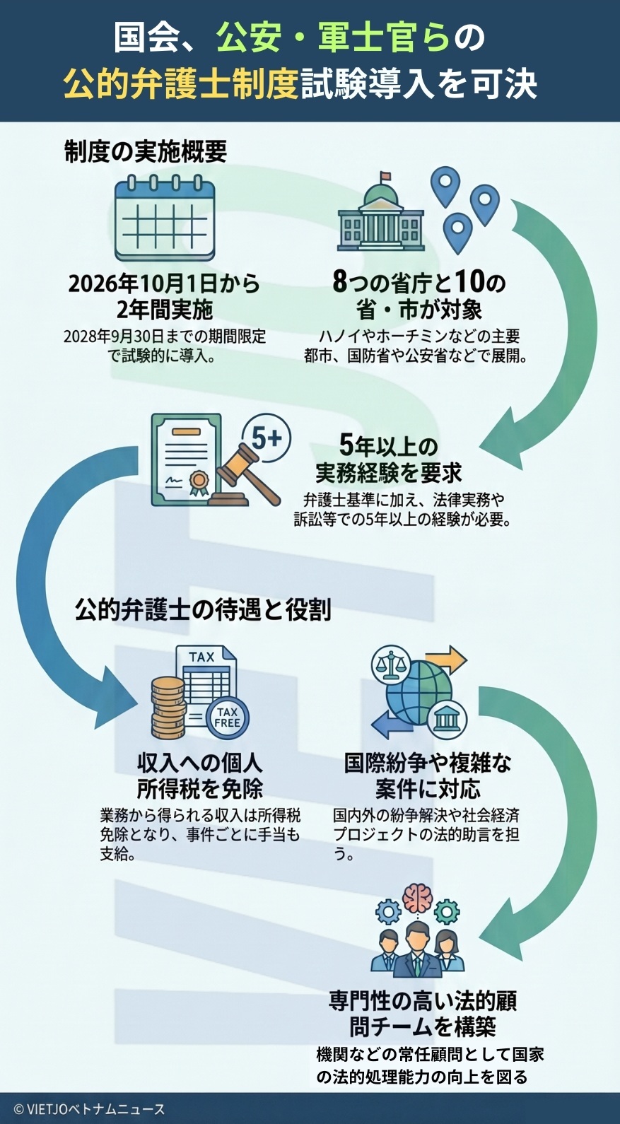国会は24日、幹部や公務員、人民軍および人民公安の士官などが公的弁護士として活動する制度を試験的に導入する決議を可決した。実施期間は2026年10月1日から2028年9月30日までの2年間で、8つの省庁と10省・市で展開される。