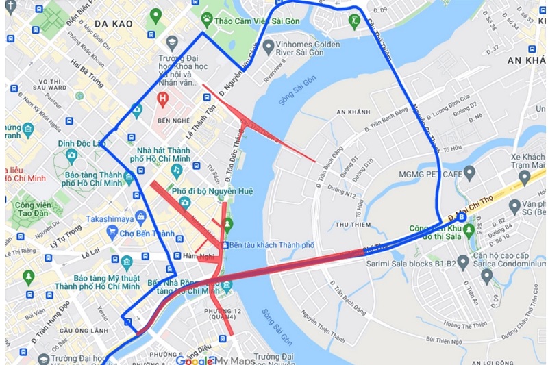 グエンフウカイン通り~トゥーティエム(Thu Thiem)橋~サイゴン川トンネル~キーコン(Ky Con)通り~チャンフンダオ(Tran Hung Dao)通り~グエンタイホック(Nguyen Thai Hoc)通り~オンライン(Ong Lanh)橋~ホアンジエウ通り