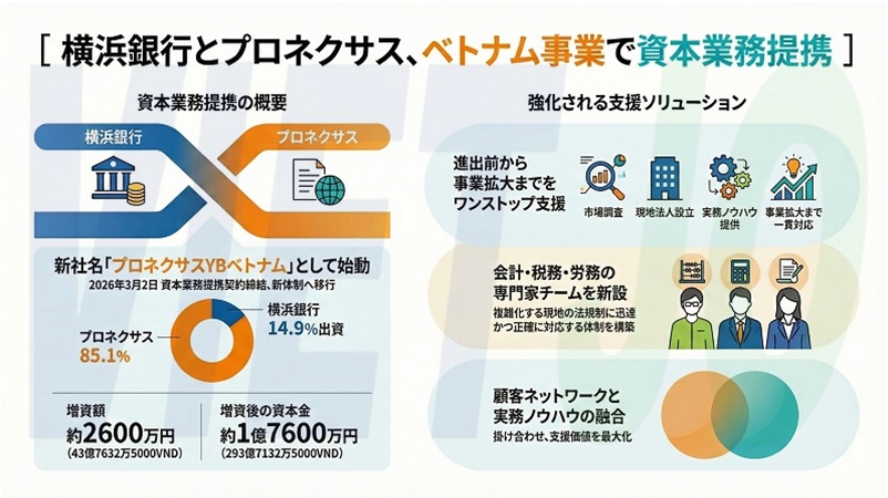 増資額は43億7632万5000VND(約2600万円)、増資後の資本金は293億7132万5000VND(約1億7600万円)で、持分比率はプロネクサスが85.1%、横浜銀行が14.9%となる。新社名は「プロネクサスYBベトナム(PRONEXUS YB VIETNAM)」となる。