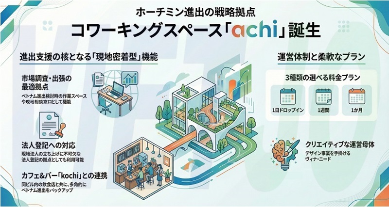「achi」は、ベトナム進出や市場調査を検討している企業が、出張期間の作業・相談拠点として利用できる現地密着型ワークスペースとなっている。現地法人立ち上げ時の法人登記にも対応する。
