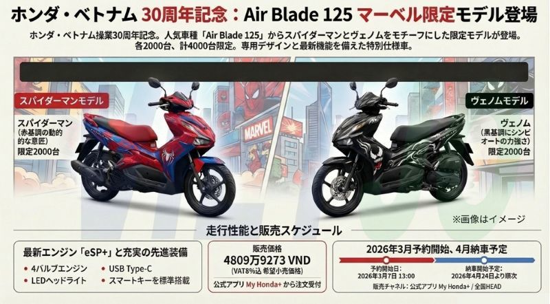 ホンダベトナム(Honda Vietnam)はこのほど、ベトナムでの操業30周年を記念し、米国のエンターテインメント企業であるマーベル・エンターテインメント(Marvel Entertainment)と協力して、売れ筋バイク「エアブレード125(Air Blade 125)」の限定モデルを発表した。